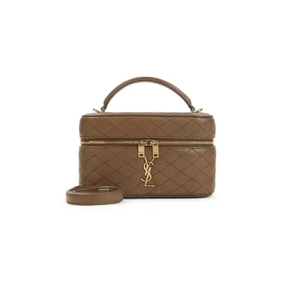 Pure brown lambskin, top handle, front zip fastening, front metallic YSL logo, tonal diamond quilting, removable and adjustable shoulder strap, one main compartment, bronze-tone hardware, 100% calf leather, made in Italy, nude & neutrals colour, dimensions W18xH11xD6.5cm, leather composition