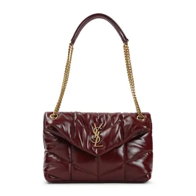 Saint Laurent Puffer LouLou Red Calf Shoulder Bag crafted from dark red padded chevron calf leather with glossy finish. Features gold-toned hardware, metal Cassandre logo, concealed magnetic fastening, sliding chain, leather shoulder strap, and one inner zip pocket. Made in Italy, dimensions W:29cm H:17cm D:11cm.