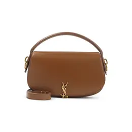 Leather shoulder bag crafted from brown leather. Features bronze-toned hardware, front metal Cassandre fastening, top handle, attachable and adjustable shoulder strap, inner pocket, and is fully lined. Made of 100% leather, part of the Nude & Neutrals collection, designed by Donna, and made in Italy with dimensions W:24cm H:14cm D:6cm.