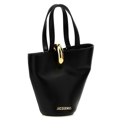 Jacquemus Ladies Bucket Bag. SKU: BAW00389AC01C01990. Color: Black. Jacquemus La Bambola Small Bucket Bag. The la bambola small bucket bag is a sophisticated accessory with a contemporary and refined design. crafted from smooth leather, it stands out for its asymmetrical silhouette and refined details, such as the front closure with a gold metal ring and the logo applied on the bottom. equipped with two on-top handles and an adjustable and removable shoulder strap, it offers versatile portability. the interior, with a single compartment, is completed by a practical zip pocket, perfect for neatly storing essentials. Composition: 100% % Calf Leather Bos Taurus.