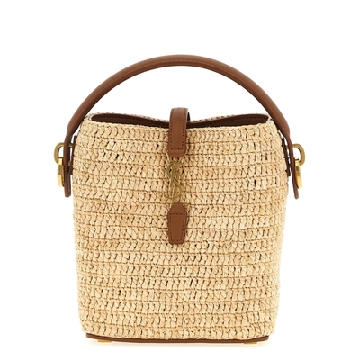 Saint Laurent Ladies Bucket Bag. SKU: 765870GAAFC2080. Color: Beige. Saint Laurent le 37 Mini Bucket Bag. Le 37' mini bucket bag in woven raffia with leather details, fixed leather handle, closure with interlocking antiqued metallic Cassandra logo, antiqued metal details, adjustable and removable leather shoulder strap. Composition: 100% raffia