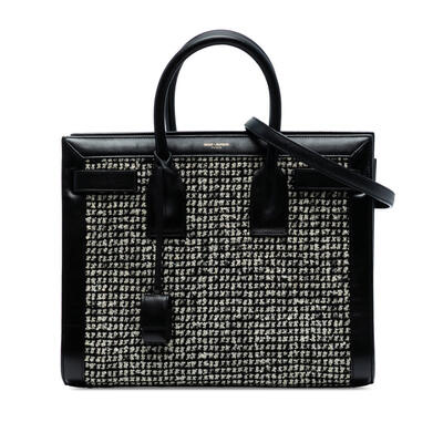 The Sac de Jour features a tweed body with leather trim, rolled leather handles, an open top, an interior zip compartment, and interior zip and slip pockets. Saint Laurent Ladies Satchel. SKU: GNR355153 0714. Color: Black. Size: 15 x 26 x 31.5. Pre-owned Saint Laurent Small Tweed Houndstooth Sac De Jour Satchel GNR355153 0714.