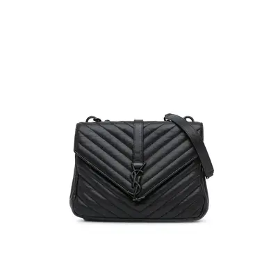 The College satchel features a quilted leather body a flat leather top handle a detachable chain link strap with leather guard a front flap with magnetic closure an exterior back slip pocket and interior zip and slip pockets. Exterior front has been repainted.