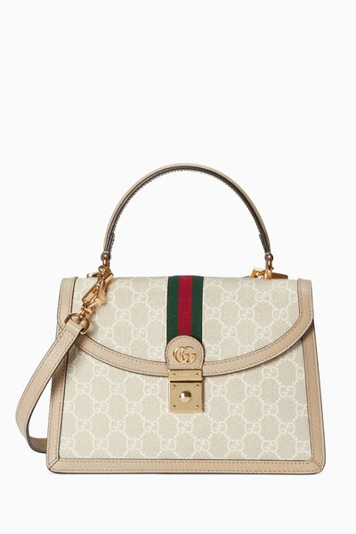 Signature motifs from Italian label Gucci's archives make the Ophidia bag's designer origins instantly recognisable. The medium flap-top tote from the Love Parade collection is crafted from GG Supreme canvas and leather with a striped Web embellishment and gold-tone logo hardware.
