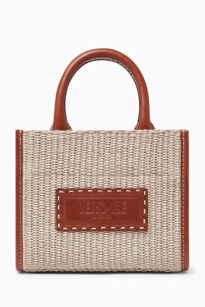 Woven from a chic raffia-effect cotton-blend fabric, the Versace Athena tote bag adds a touch of Italian luxury to your everyday essentials. Whip-stitched leather handles elevate the design, while a detachable crossbody strap offers hands-free convenience. Finished with an embossed Versace logo tag, its compact size makes it a stylish and functional companion for any adventure.