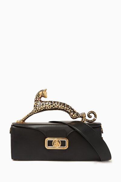 The Lanvin Pencil Cat bag isn't just a collector's dream, it's a conversation starter. This unique piece features a sculptural handle inspired by a Jeanne Lanvin fireplace accessory – a whimsical touch straight from the house's archives. Crafted in Italy from sleek, shiny calfskin, it's a perfect blend of modern luxury and historical homage.