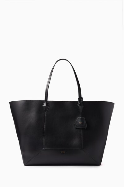 Inspired by Jimmy Choo's legendary diamond hardware, this sculpted tote captures both structure and fluidity at their finest. The result is a roomy, timeless calfskin bag that's easy to fill during busy workdays - and equally easy to fold into suitcases for out-of-office trips. The bag's elongated handles offer both handheld and over-shoulder carry.