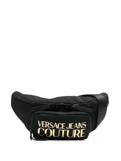 logo-print belt bag from VERSACE JEANS COUTURE featuring black, front zip-fastening pocket, top zip fastening, adjustable strap to the rear, main compartment, internal zip-fastening pocket, logo print to the front and internal logo patch.