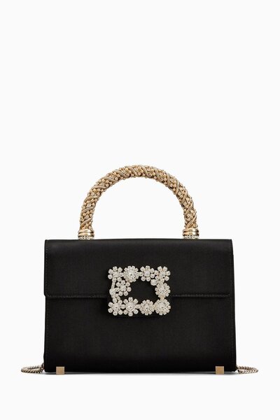 Roger Vivier's mini clutch bag is a stunning evening accessory, crafted from luxurious silk-blend satin and adorned with an exquisite crystal buckle. Its elegantly jewelled handle and concealed metal chain offer versatility for carrying options, while the feet at the bottom ensure it stands out beautifully. This mini bag pairs perfectly with a chic cocktail dress or tailored evening wear for a elegant finish.