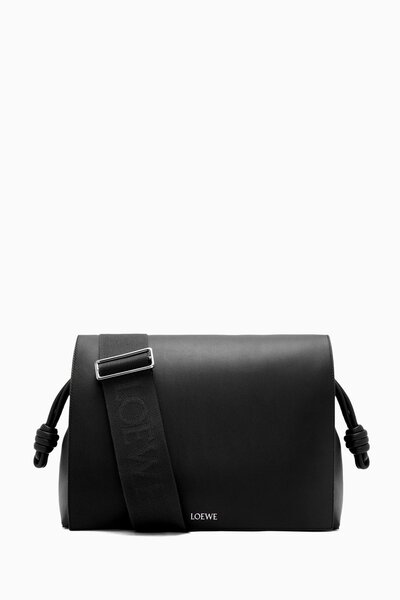 Eye-catching with its minimalism and shiny finish, this calfskin Loewe satchel serves up a new era of contemporary sleek. • Embossed logo details adorn the bag's front and adjustable, webbed shoulder strap • Knotted drawstring lend structure to the design's relaxed silhouette • Crafted in Spain from supple, suede-lined calfskin