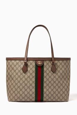 The Ophidia Medium Tote by Gucci is characterised by the signature GG motif and classic design that is synonymous with the brand. The traditional silhouette is expertly crafted in the GG Supreme canvas and features leather top handles and the metal finish logo. Style with oversized sunglasses and wide-leg trousers for an effortlessly elegant finish.