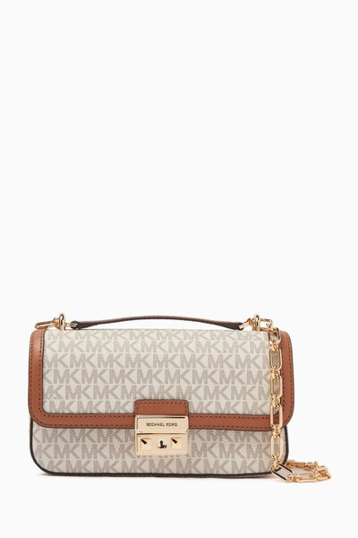 A Michael Kors classic easily outlasting seasons with its timeless codes, the small Tribeca shoulder bag is a cosmopolitan wear-anywhere style. Sealed by a logo-engraved lock and illuminated by an adjustable, padded chain-link strap, the design exudes elegance, while keeping a low-key profile with its small proportions and coated canvas body.