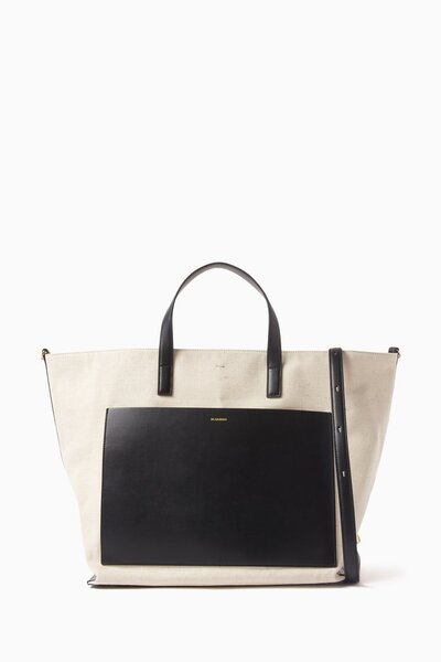 The Wander medium tote bag by Jil Sander epitomises sleek simplicity. A practical choice for busy days, it is crafted from cotton-linen canvas and leather and is equipped with top handles and a detachable strap for styling versatility.