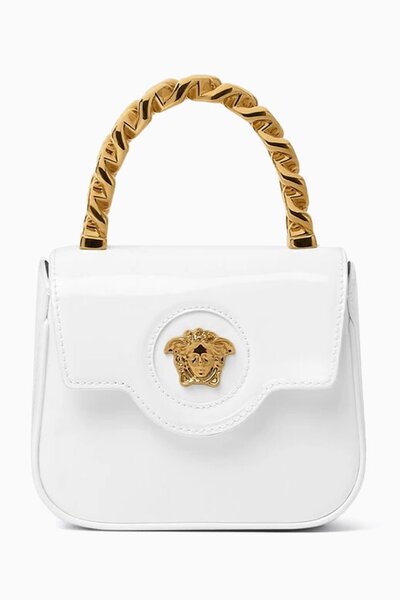 Sculpted details render Versace's vintage-inspired mini top-handle bag equally suited to contemporary wardrobes. An unapologetic accent piece, its curved silhouette was crafted from patent leather that's contrasted by the gold-tone shine of the Medusa hardware and rigid chain handle.
