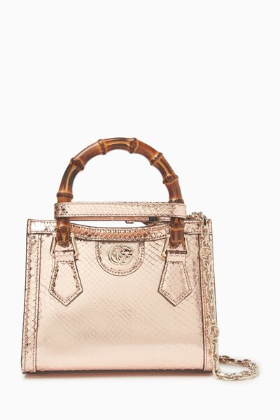 This Diana mini tote bag embodies iconic Gucci features with bamboo handles and Double G hardware. Notice its striking metallic python exterior, adorned with decorative tonal handle shapers, and enjoy the versatility of the detachable and adjustable shoulder strap.