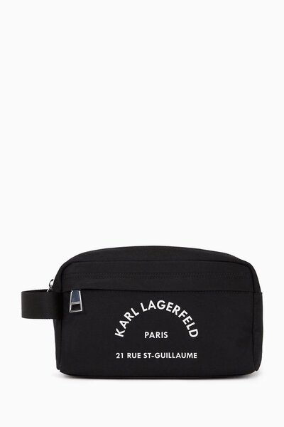 True to Karl Lagerfed's signature palette and simplicity, this wash bag promises to remain sleek and of-the-moment, season after season. • A curved logo accent brings a striking contrast against the woven nylon exterior • A front zip pocket provides even more space for small grooming essentials • The design's roomy main compartment is sealed by a logo-engraved zip closure