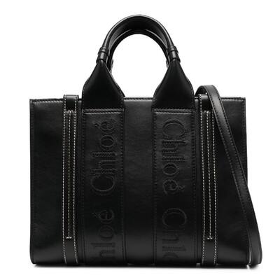 Chloe Ladies Tote. SKU: CHC23US397I60-BLACK. Material: Calfskin;Linen. Closure Type: Open. Color: Black. Size: W: 25.5cm x H: 18.5cm x D: 8.5cm.. Chloe Woody Small Logo Embroidered Leather Tote. Tote crafted from calf leather with an embroidered logo on the front and strap detailing. Features an open top, two top handles, and an adjustable, detachable shoulder strap. Lined with linen, it includes an internal logo patch, a patch pocket, and a spacious main compartment. Finished with gold-tone hardware. 100% Calfskin, 100% Linen. Made in Italy.