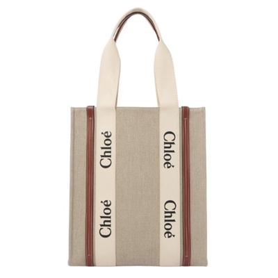 Chloe Ladies Tote. SKU: CHC24SS366I2627S. Barcode: 7614027152715. Color: Sepia Rose. Size: H16 x W13 x D4. Chloe Woody Canvas Tote Bag. Crafted from linen canvas, this tote features buffed calfskin trim and logo-bonded webbing accents. It has twin rolled carry handles, a spacious main compartment with an interior patch pocket, and is fully lined. The design is completed with contrasting leather strips and the signature Chloe logo ribbon. Material: Linen and Calfskin.