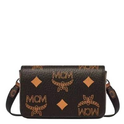 MCM Ladies Crossbody. SKU: MXZDATA02BK. Color: Black. Size: 1.6 x 7.3 x 4.5 inches. MCM Maxi Visetos Aren Camera Bag. Crafted from Visetos monogram canvas, the Aren bag features a detachable fabric webbing strap, a back exterior zip pocket, a magnetic snap closure, an interior slip pocket, dark metal hardware, and a microfiber lining with a suede finish. Strap drop: 23.6.