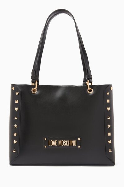 Striking the perfect balance between practical and bold, this studded shopper bag speaks true to Love Moschino's tough-luxe edge. Crafted from faux leather, the bag opts for a roomy, relaxed silhouette, detailed with practical shoulder straps, a gold-tone logo plaque and studded trim.