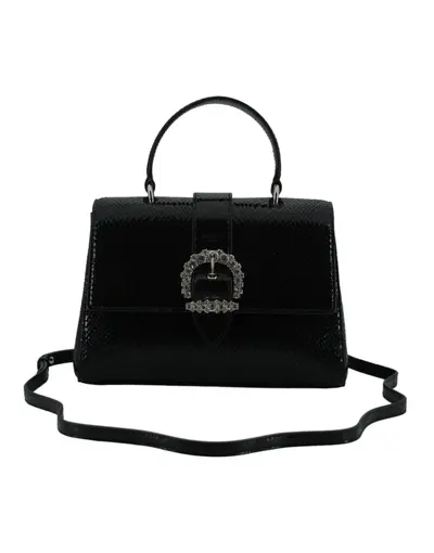 Details: Handbag realised in calf leather. With removable leather shoulder strap and magnetic button closure under the flap. With Cristal detailed hardware. Three main compartments and internal zip pocket.