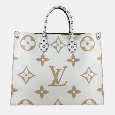 The Giant Monogram On The Go GM bag offers a bold interpretation of Louis Vuittons classic Monogram pattern. The oversized logo in white, khaki, and beige tones creates a striking visual impact, while the gold accents add a hint of luxury. Its spacious interior makes it ideal for daily use.