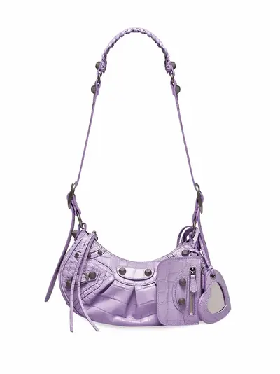 lilac leather embossed crocodile effect stud embellishment decorative buckle detailing pleat detailing mirror tag removable pouch silver-tone hardware front zip-fastening pocket top zip fastening adjustable shoulder strap