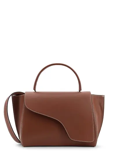 Asymmetrical closure with flap and button. Features a leather handle and removable, adjustable leather shoulder strap. Single compartment design. Made in Italy from Vacchetta leather with cotton lining. Dimensions: W 25 cm x H 19 cm x D 8.5 cm.