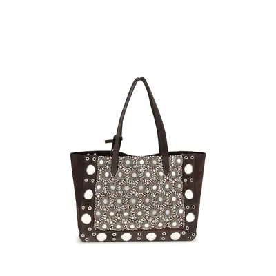 Valentino Garavani’s Nellcôte medium Tote Bag is a dramatic and refined accessory embellished with mirror and sequin embroidery. The profile is decorated with iconic ball studs and rivets, distinctive elements of the maison. Equipped with comfortable handles, it can be carried either by hand or on the shoulder. Completing the design is the small metallic detail with Signature VLogo and a removable internal pouch, perfect for holding essentials.