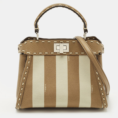 Fendi Brown Marco Stitch Selleria Leather Pequin Fabric Mini Peekaboo Top Handle Bag 1214236