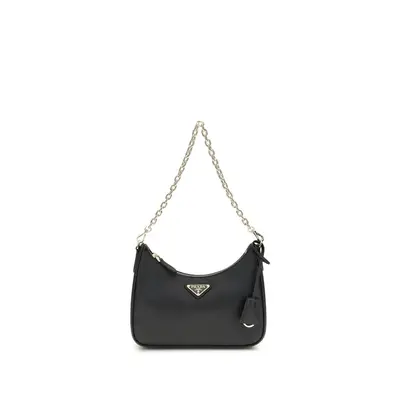 The 2005 Re-Edition Shoulder Bag by Prada is made of Saffiano leather, with an elegant logoed triangle on the front and a removable leather accessory with key ring. Equipped with a metal chain handle and adjustable tonal fabric shoulder strap, the bag also offers a removable storage. The zippered closure provides practicality and security, making it a refined and versatile accessory.