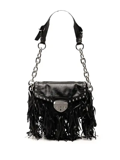 leather body with fringe details chain link strap with leather pad front flap with buckle closure interior zip and slip pockets black Inclusions: key. Condition: GOOD. This previously owned and used item is in good condition with minimal signs of use. This may include fading of material or plating and scratches. Please refer to the photos on this product page for a detailed view of the item, including any damages declared.
