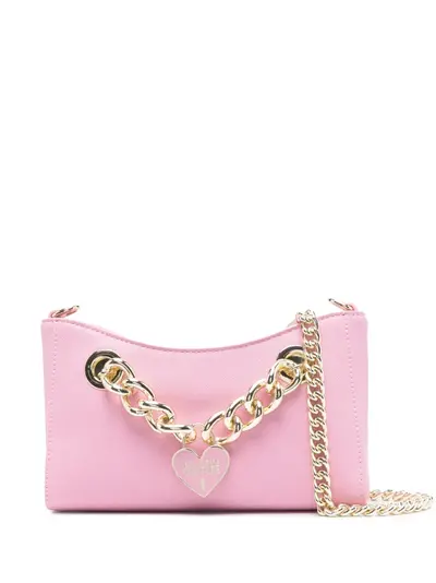 pink faux leather slub texture enamel detail heart charm logo embellishment gold-tone hardware oversize chain-link detailing faux-leather and chain-link shoulder strap top zip fastening main compartment internal logo plaque logo-embellished lining