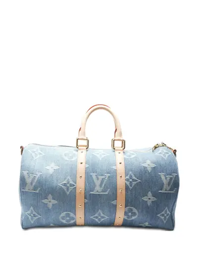 2022-2025 light blue denim monogram pattern two top handles studded straps top zip fastening gold-tone hardware internal slip pocket Condition: GOOD. This previously owned and used item is in good condition with minimal signs of use. This may include fading of material or plating and scratches.