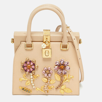 Delicate craftsmanship meets drama in this Dolce and Gabbana top handle bag. Made from beige lizard embossed leather, it’s adorned with crystal floral accents that shimmer against the textured surface. The structured frame and gold clasp evoke old world charm, perfect for evenings that deserve something extraordinary.