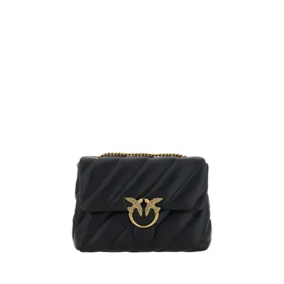 Calfskin Love Puff Shoulder Bag by Pinko, magnetic button front fastening, an iconic gold-plated Love Birds logo embossed on the front, a quilted and padded design, a triple interior compartment, a sliding chain shoulder strap, and an iconic tone-on-tone embroidered brand monogram on the back.