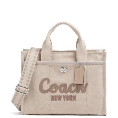 Coach Ladies Tote. SKU: CP158 LHVRA. Color: Dark Natural. Size: L 13.5 x W 6.25 x H 10.0. Coach Canvas Cargo Tote Bag. This tote bag features one twist lock pocket on the front, a snap pocket on the back, a zipper closure, two handles, a removable and adjustable shoulder strap, silver-coloured metal fittings, a detachable pendant, and a spacious main compartment.