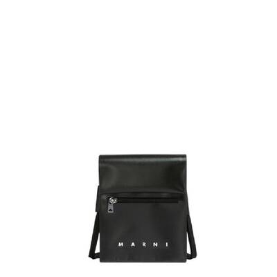 Marni Mens Crossbody. SKU: SBMQ0036A1-BLACK. Color: Black. Size: L 7.87 X H 6.30 X W 1.57. Marni Shoelace Strap Crossbody Bag. This gusseted pouch with a long shoelace-style strap features a double snap button flap closure, a front zip pocket, the Marni logo print, and Palladium hardware. 64% Polyurethane 36% Polyester.