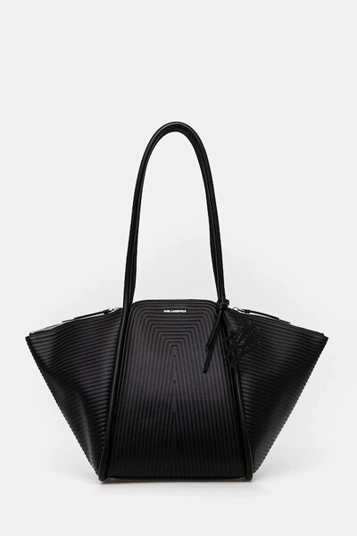 Большая сумка из коллекции Karl Lagerfeld. Модель на молнии, выполнена из экокожи. - Застежка-молния и магнитная застежка. - Внутренних карманов нет. - Модель без подкладки. - Вмещает формат А4. - В комплект модели входит брелок. - Длинные ручки для удобной переноски в руке или на плече. - Входящий в комплект тканевый чехол защищает изделие от пыли. - Глубина: 19,5 см. - Высота: 26,5 см. - Ширина у основания: 25 см. - Длина ручки: 66 см.