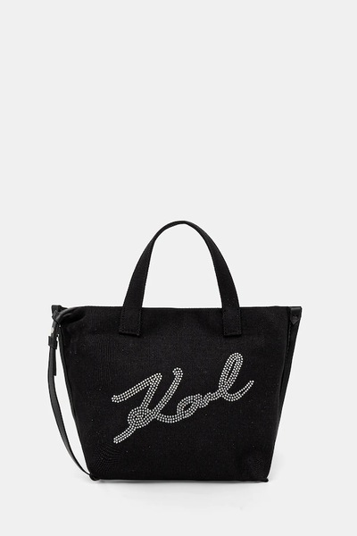 Маленькая сумочка из коллекции Karl Lagerfeld. Модель на молнии, выполнена из текстиля. - Модель частично изготовлена из переработанного хлопка. - Не подходит для формата А4. - Застежка-молния. - Модель на подкладке. - Имеет ручку и съемный регулируемый ремень. - Модель со стразами. - Минимальная длина ремешка: 104 см. - Максимальная длина ремня: 112 см. - Длина ручки: 31 см. - Глубина: 9 см. - Высота: 19,5 см. - Ширина у основания: 22 см.