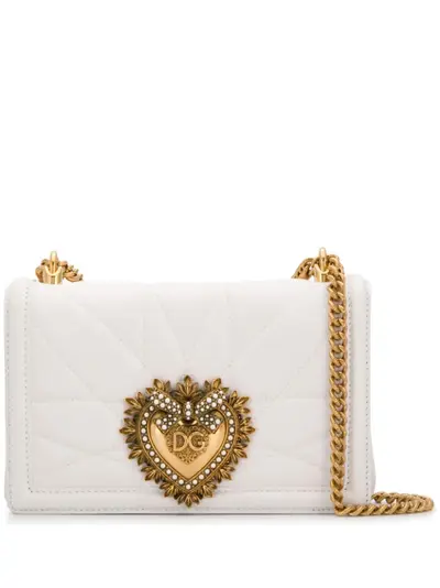 Средняя сумка через плечо 'Devotion' от Dolce & Gabbana (Дольче энд Габбана). Клапан с портфельной застежкой, прошитые панели, внутренний карман на молнии и золотистая цепочка на плечо. Цвет: белый.