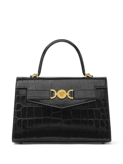 Подробнее о товаре: • черный • телячья кожа • тиснение под кожу крокодила • металлический декор Medusa • верхняя ручка • съемный ремень на плечо • откидной верх на магнитной застежке • несколько отделений • тисненый логотип внутри • золотистая фурнитура