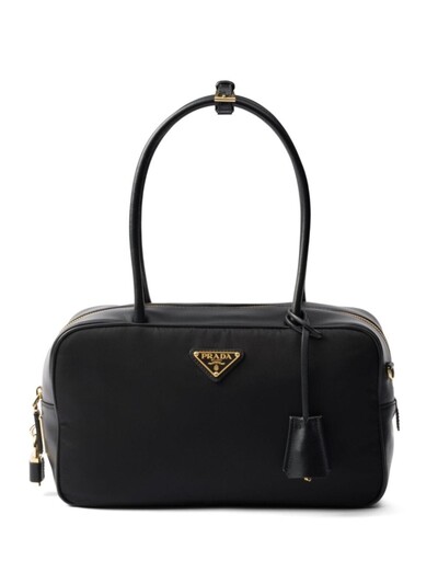 Подробнее о товаре: • черный • переработанный нейлон • телячья кожа • дизайн со вставками • застежка на молнии сверху • две закругленные верхние ручки • треугольный эмалированный логотип • висячий замок • основное отделение • внутренний карман на молнии • металлический логотип внутри • В комплект входит мешок-пыльник для хранения.