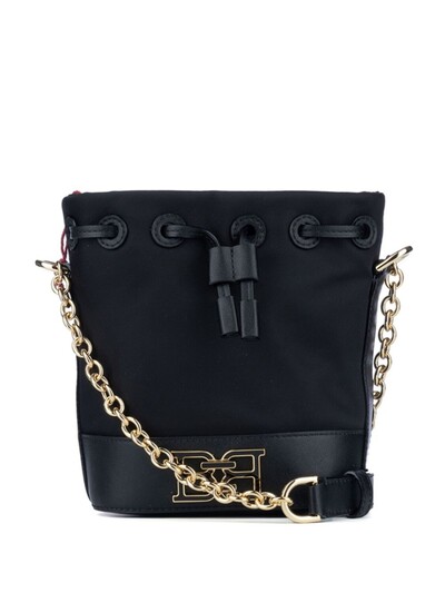Подробнее о товаре: • черный • завязка на шнурке • ремень на плечо с цепочной деталью • металлический логотип • кожаная отделка • золотистая фурнитура • внутренний карман на молнии