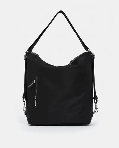 Сумка через плечо из блестящего красного нейлона с деталями из эко-кожи, трансформируется в рюкзак простым движением руки, функциональная и легкая, со спортивно-шикарным внешним видом. Внешние карманы интегрированы в конструкцию изделий. Индивидуальный интерьер с множеством карманов. Металлическая фурнитура, фирменный язычок молнии и металлический буквенный логотип.