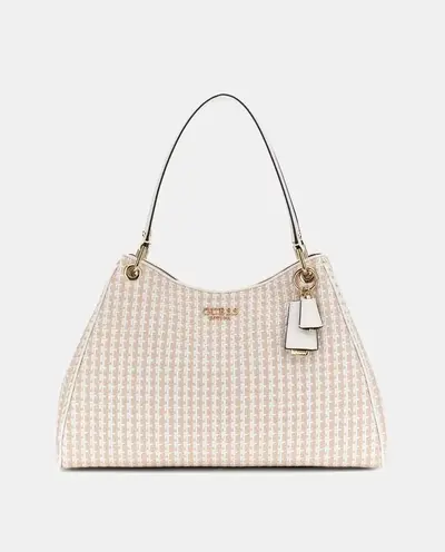 Сумка через плечо модели Mirema из двухцветной рафии, с магнитной застёжкой, двойными ручками, металлическим логотипом Guess 1981 золотого цвета спереди и внешним задним карманом на молнии.