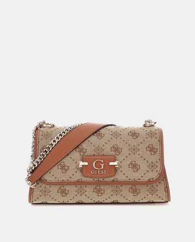 Модель бандолеры Неда с отделкой под новый логотип и магнитным клапаном, центральным металлическим логотипом Guess и регулируемой ручкой золотистого оттенка, а также наружным карманом с задней стороны на молнии.