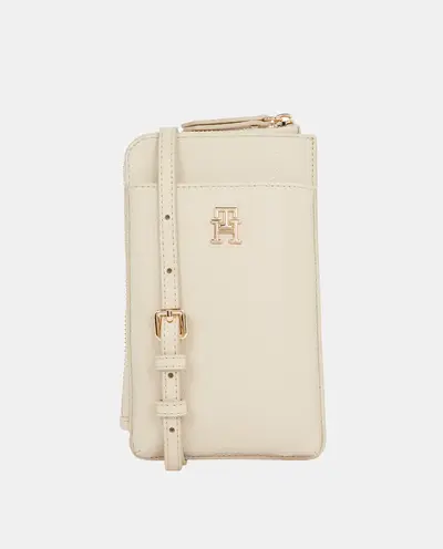 Женская сумка для мобильного телефона, изготовленная из экокожи бежевого цвета. Дизайн с кармашком для карт, кошельком и регулируемой ручкой. Деталь с металлическим логотипом Tommy Hilfiger спереди.
