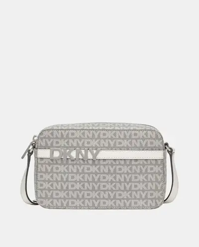 Сумка для камеры Bolso AVRIL с длинным регулируемым ремнем и монохромным рисунком. Она застегивается на молнию и имеет металлический логотип DKNY золотого цвета.