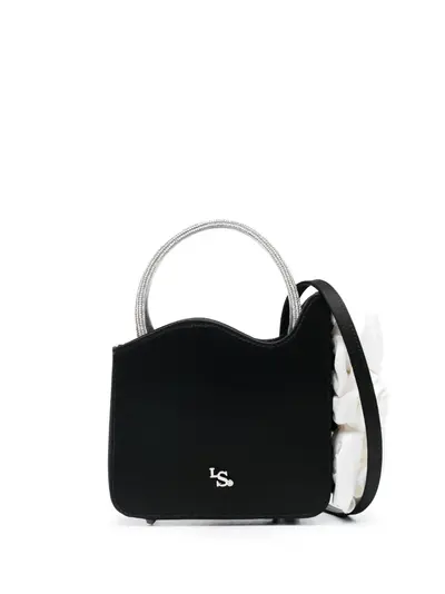 Черный/белый, серебристый, козья кожа, сатиновая фактура, декор в виде искусственного цветка, украшения из горного хрусталя, серебристый металлический логотип, дизайн с открытым верхом, съемный регулируемый ремень на плечо и две закругленные верхние ручки.